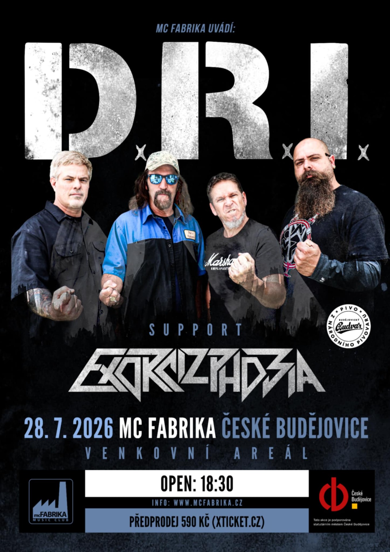 Přátelé a kamarádi, máme velikou radost a čest pohostit na domácí půdě americkou legendu thrash-crossover scény, velikány D.R.I.!!! S nimi zahraje česká jednička v oboru, trutnovští Exorcizphobia. Koncert proběhne v úterý 28. 7., pod širým nebem, na nádvoří českobudějovického klubu MC Fabrika!